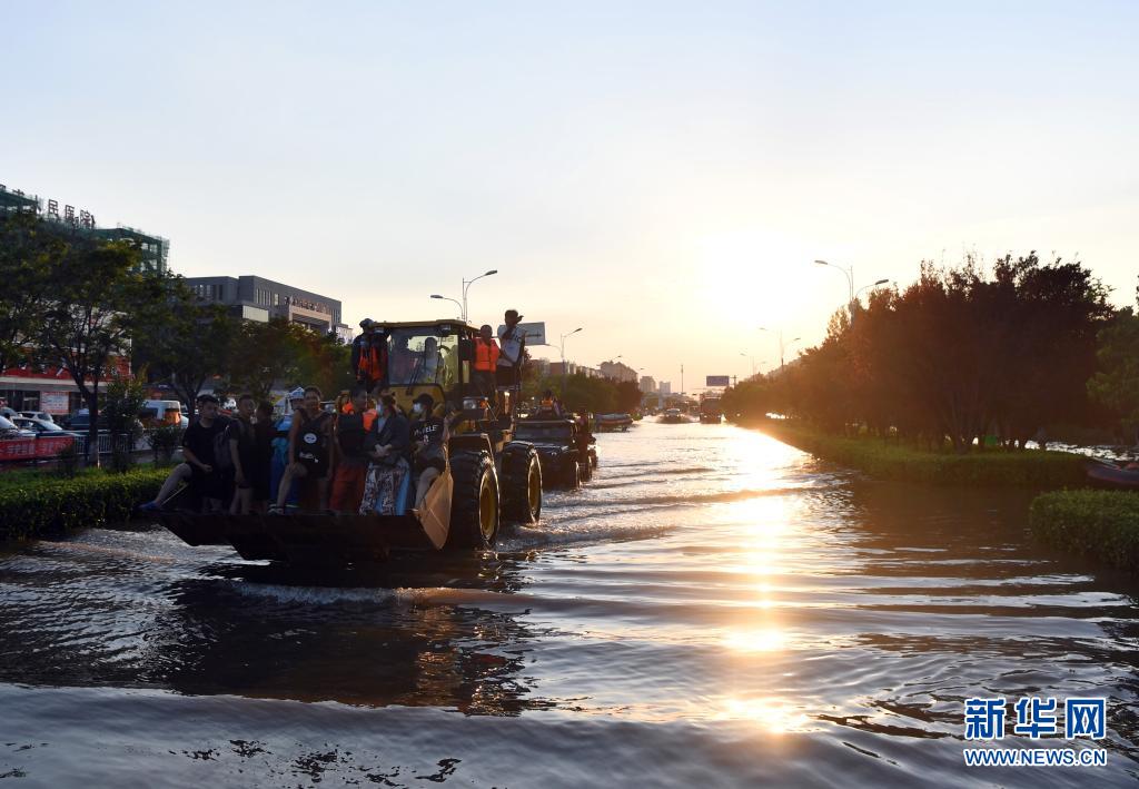 7月26日,在河南省衛(wèi)輝市,受困群眾乘坐鏟車轉移。