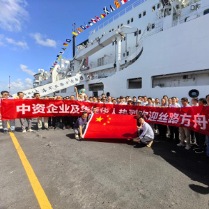 12月20日,执行“和谐使命-2025”任务的中国海军“丝路方舟”号医院船抵达巴巴多斯布里奇敦港。这是欢迎人群在医院船旁合影。