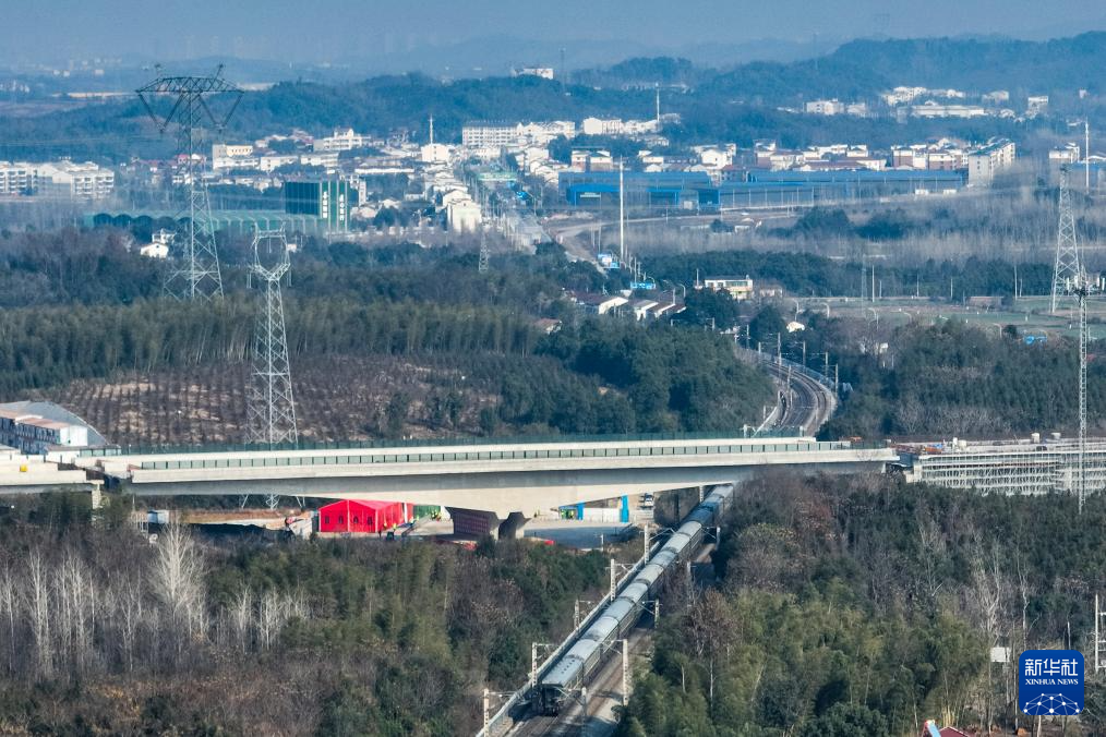12月25日,桥体顺利完成转体后,列车从桥体下方驶过(无人机照片)。