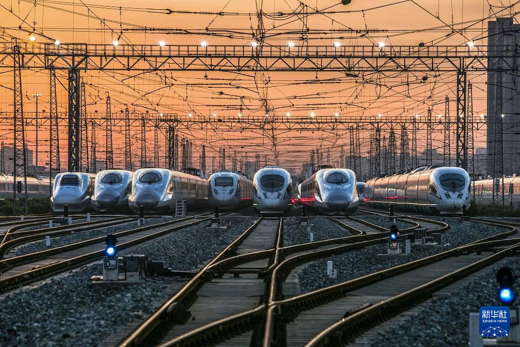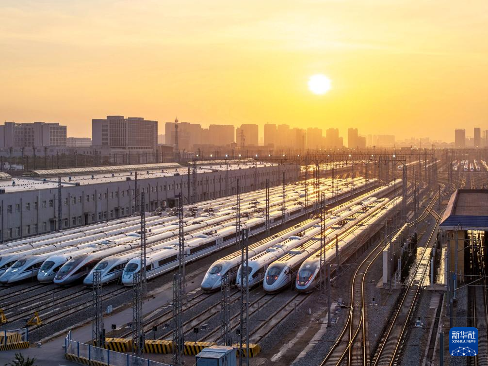 春运大幕即将拉开,中国铁路西安局集团有限公司西安动车段内,高铁动车组静候待发。