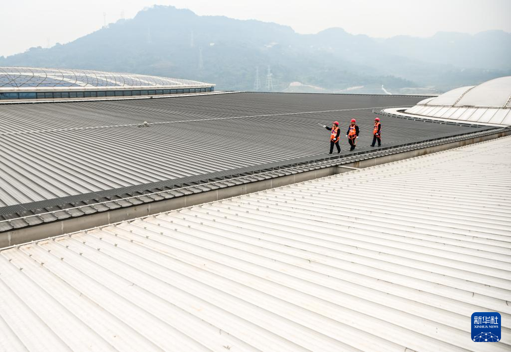 2月3日,蹇洲(左)和胡渝平在重庆东站站房屋顶马道上进行巡检作业。