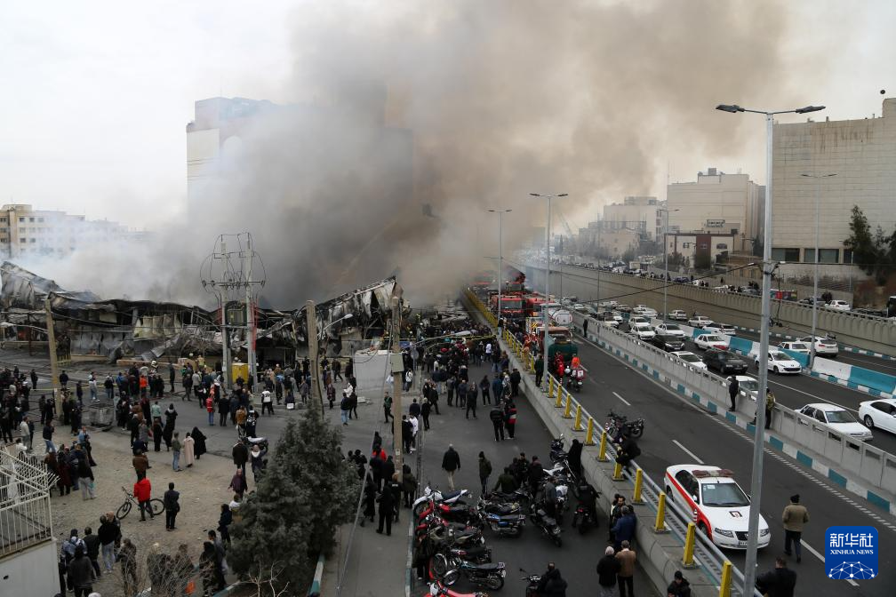 2月3日,在伊朗首都德黑兰,人们聚集在火灾现场附近。
