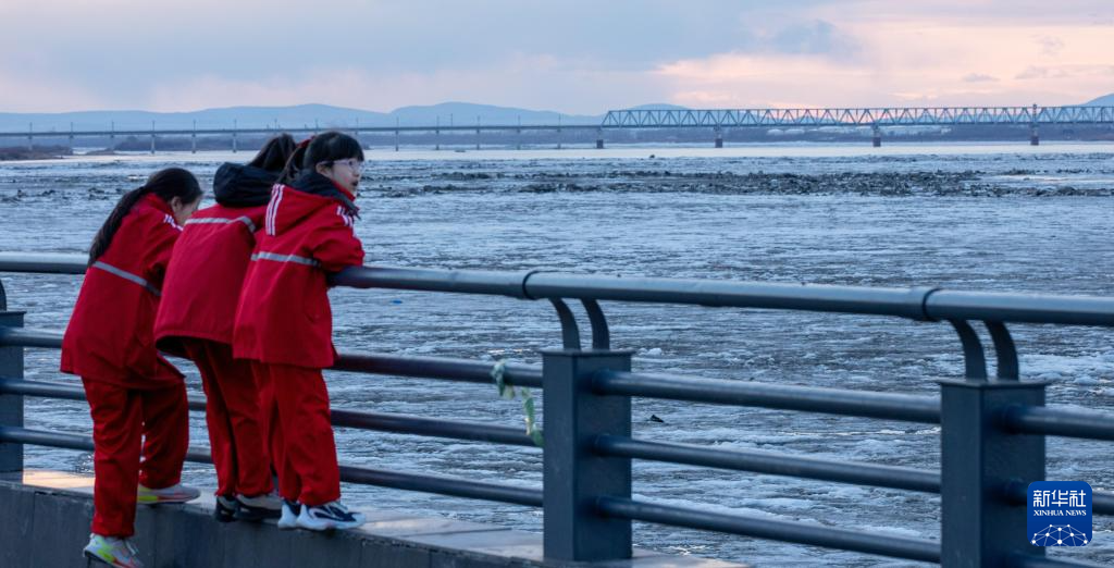 4月13日,几名学生在观看松花江干流佳木斯段的流冰景观。