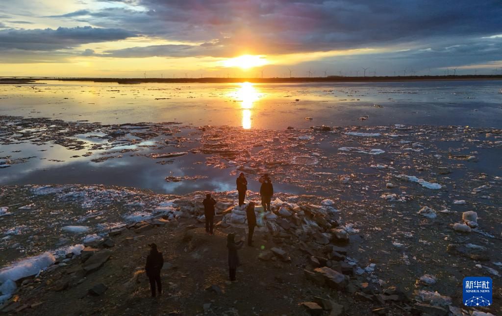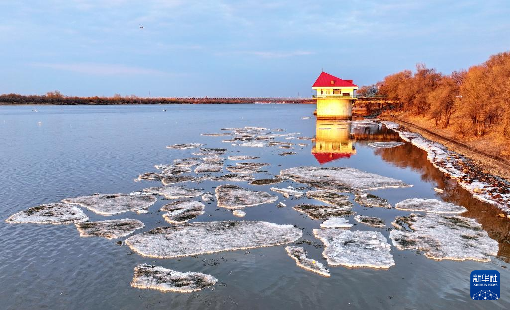 4月14日,在黑龙江干流嘉荫段,朝阳下的流冰与飞鸟相映成趣。