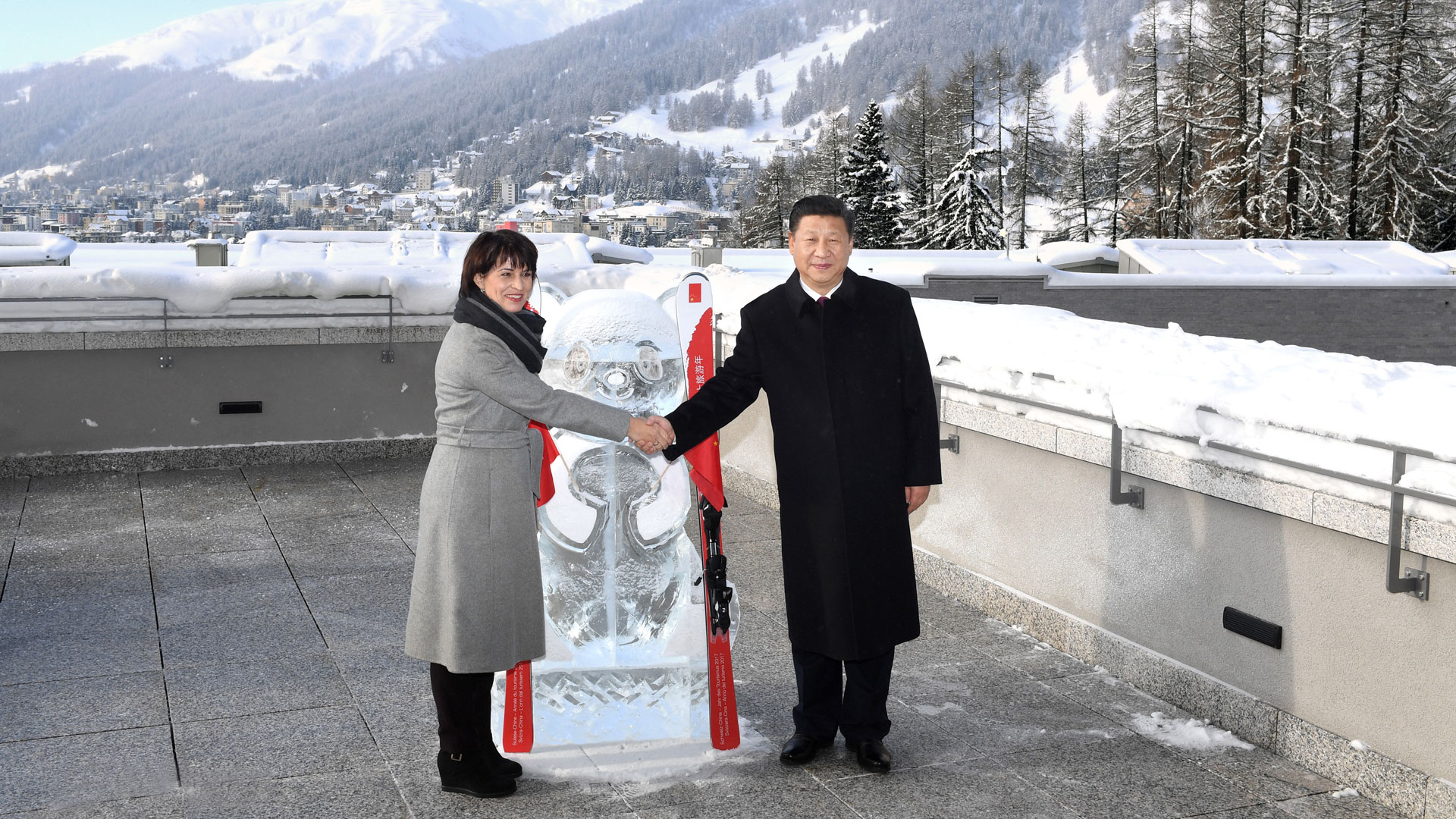 1月17日,國(guó)家主席習(xí)近平同瑞士聯(lián)邦主席洛伊特哈德在達(dá)沃斯共同啟動(dòng)中瑞旅游年。兩國(guó)元首在熊貓冰雕像和印有中瑞兩國(guó)國(guó)旗及“中瑞旅游年”字樣的滑雪板旁合影留念。新華社記者 丁林 攝2017-01-18
