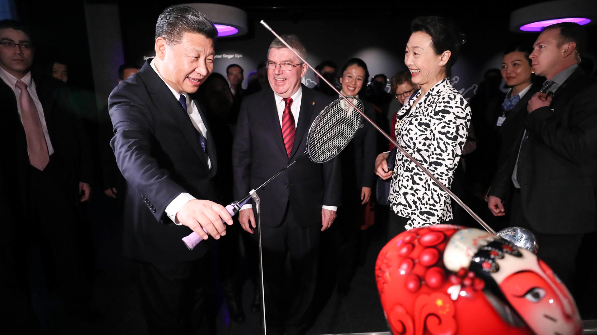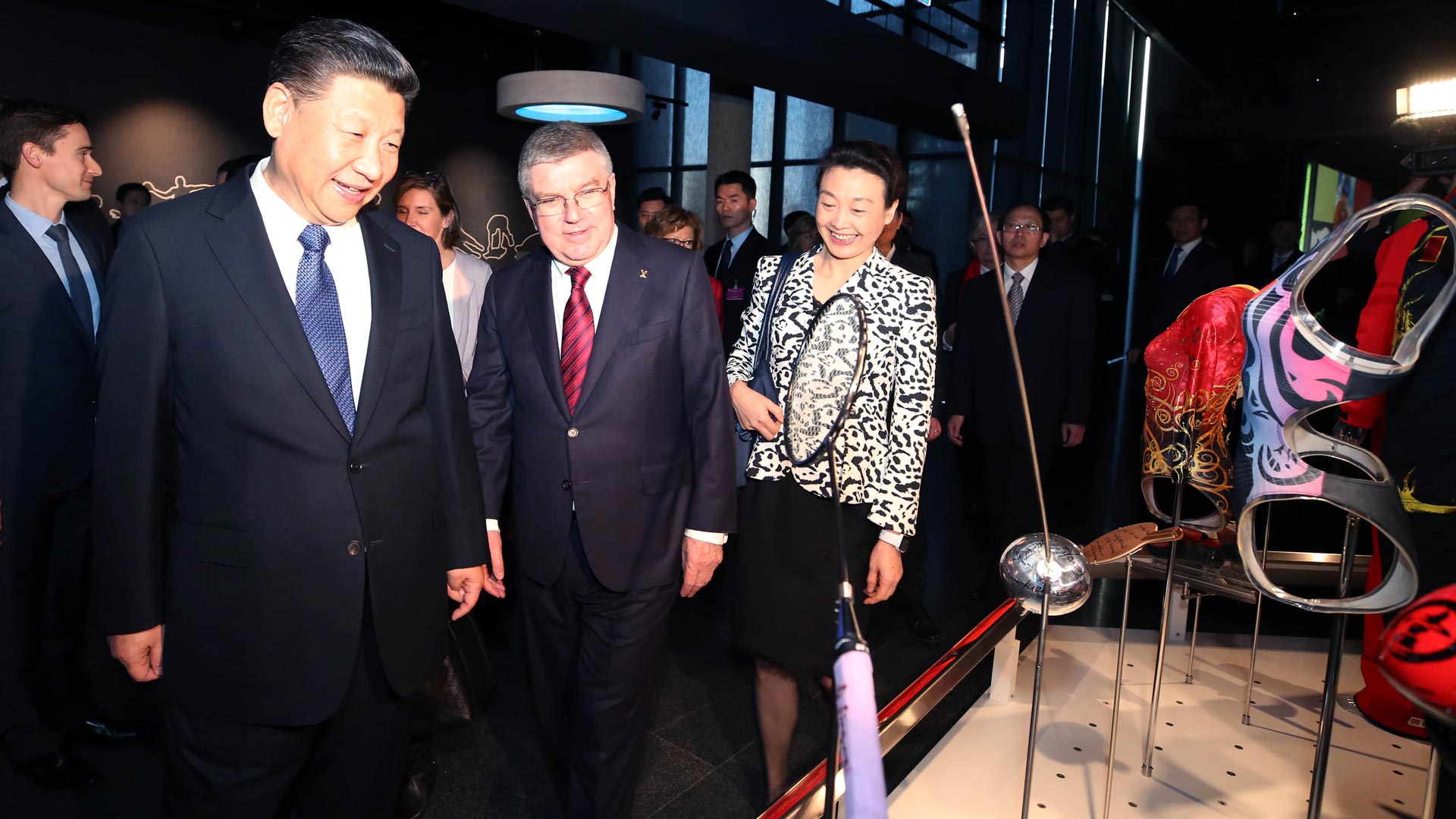 1月18日,國(guó)家主席習(xí)近平在瑞士洛桑國(guó)際奧林匹克博物館會(huì)見國(guó)際奧林匹克委員會(huì)主席巴赫。這是習(xí)近平在巴赫陪同下,參觀羽毛球世界冠軍李玲蔚用過的球拍。新華社記者 蘭紅光 攝2017-01-19
