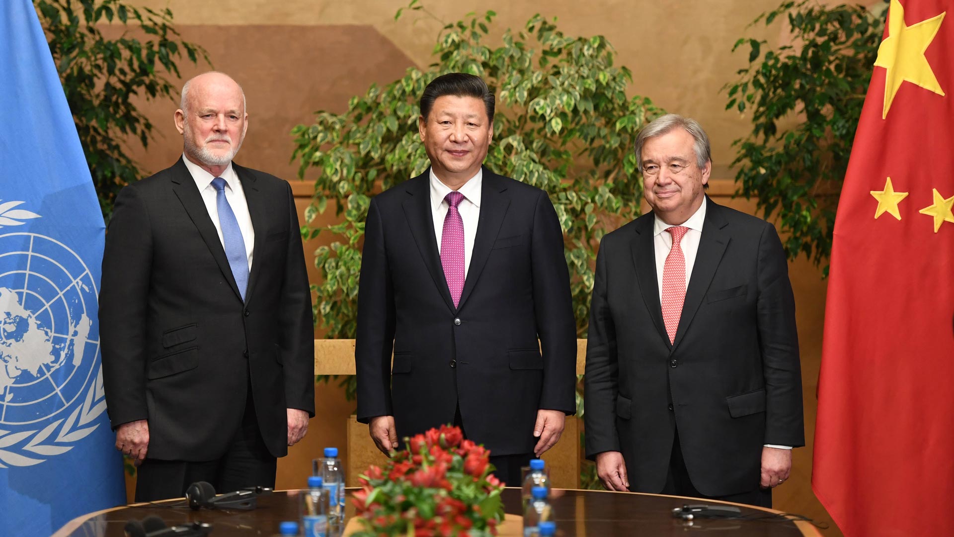 1月18日,國(guó)家主席習(xí)近平在瑞士日內(nèi)瓦萬國(guó)宮會(huì)見第71屆聯(lián)合國(guó)大會(huì)主席湯姆森和聯(lián)合國(guó)秘書長(zhǎng)古特雷斯。 新華社記者 張鐸 攝2017-01-19