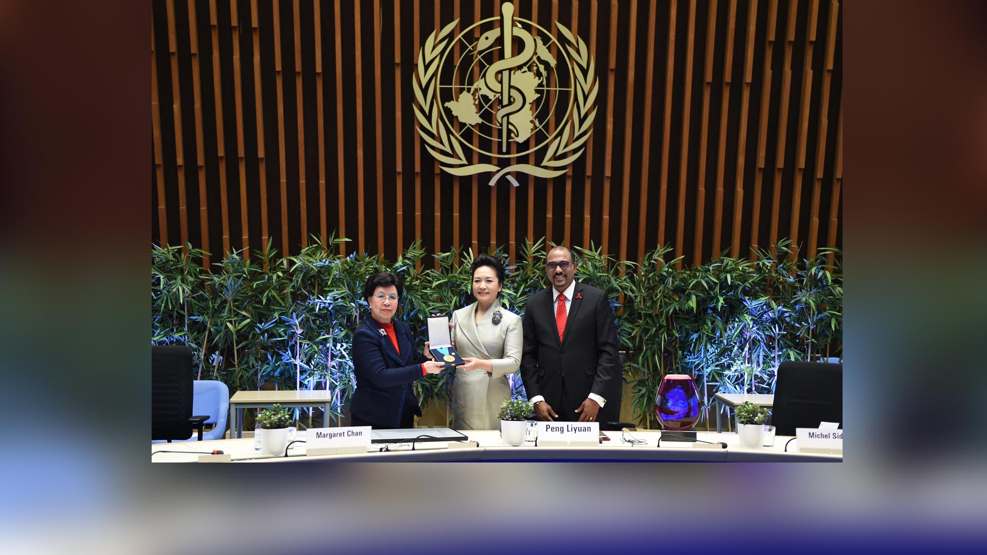 1月18日,國(guó)家主席習(xí)近平夫人、世界衛(wèi)生組織結(jié)核病和艾滋病防治親善大使彭麗媛應(yīng)世界衛(wèi)生組織總干事陳馮富珍和聯(lián)合國(guó)艾滋病規(guī)劃署執(zhí)行主任西迪貝邀請(qǐng),在瑞士日內(nèi)瓦出席為她舉行的親善大使任期續(xù)延暨頒獎(jiǎng)儀式。這是世界衛(wèi)生組織總干事陳馮富珍向彭麗媛頒發(fā)世衛(wèi)組織榮譽(yù)勛章。新華社記者謝環(huán)馳攝2017-01-19