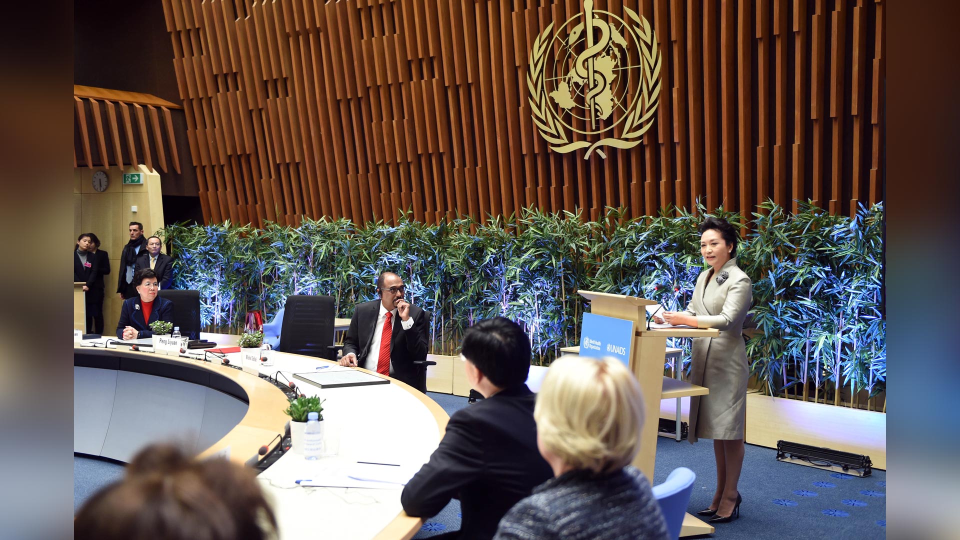 1月18日,國(guó)家主席習(xí)近平夫人、世界衛(wèi)生組織結(jié)核病和艾滋病防治親善大使彭麗媛應(yīng)世界衛(wèi)生組織總干事陳馮富珍和聯(lián)合國(guó)艾滋病規(guī)劃署執(zhí)行主任西迪貝邀請(qǐng),在瑞士日內(nèi)瓦出席為她舉行的親善大使任期續(xù)延暨頒獎(jiǎng)儀式。這是彭麗媛在儀式上致辭。新華社記者謝環(huán)馳攝2017-01-19