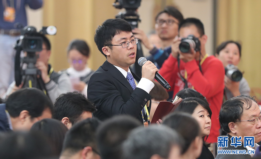10月26日上午10:00,中國(guó)共產(chǎn)黨第十九次全國(guó)代表大會(huì)新聞發(fā)言人在梅地亞賓館二層新聞發(fā)布廳召開(kāi)專(zhuān)題新聞發(fā)布會(huì),請(qǐng)有關(guān)方面負(fù)責(zé)人解讀十九大報(bào)告,并回答記者關(guān)心的問(wèn)題。圖為中國(guó)日?qǐng)?bào)記者提問(wèn)。新華網(wǎng) 王成云 攝