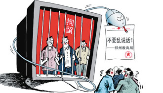 | 江蘇邳州教育局今年8月27日向該市各中小學(xué)、民辦學(xué)校等機(jī)構(gòu)下發(fā)了一個(gè)紅頭文件。文件稱,去年以來邳州已有3名教師因在互聯(lián)網(wǎng)上散布不實(shí)言論被拘留,廣大教師“要注意形象,講政治,講大局,不該做的事不要做、不該說的話不亂說”,文件的真實(shí)性得到了邳州市教育局辦公室主任的證實(shí)。 |