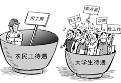 | 當(dāng)前,盡管農(nóng)民工在擇業(yè)上還遭遇歧視,大多數(shù)農(nóng)民工從事著最苦、最累、最臟、最險(xiǎn)及城市人最不愿意干的“五最”行業(yè),但明顯的事實(shí)是,由于主張權(quán)益的新生代農(nóng)民工的日益壯大,他們的權(quán)益保障已經(jīng)受到了重視,而“農(nóng)民工工資高出大學(xué)生”顯然與此有關(guān),也與整整社會(huì)的環(huán)境有關(guān)。