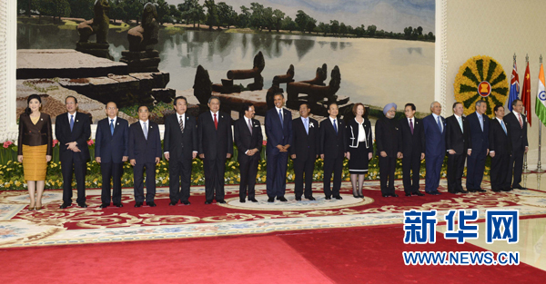 ??? 11月20日,第七屆東亞峰會在柬埔寨金邊舉行。中國國務(wù)院總理溫家寶與東亞峰會其他成員國領(lǐng)導(dǎo)人共同出席。這是與會領(lǐng)導(dǎo)人在會前合影。新華社記者 張鐸 攝