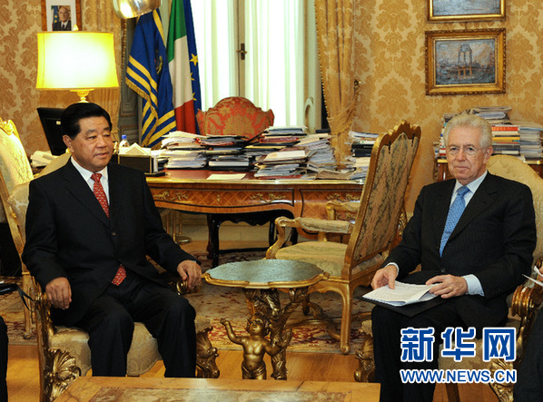 ????當(dāng)?shù)貢r(shí)間11月28日,全國政協(xié)主席賈慶林在羅馬會(huì)見意大利總理蒙蒂。(來源:新華社記者 李學(xué)仁 攝)