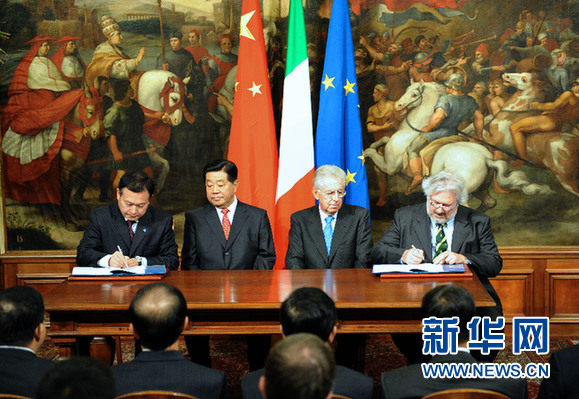 ????當(dāng)?shù)貢r間11月28日,中國全國政協(xié)主席賈慶林在羅馬和意大利總理蒙蒂共同出席中意兩國電信、新能源汽車等領(lǐng)域合作項(xiàng)目協(xié)議的簽字儀式。(來源:新華社記者 李學(xué)仁 攝)