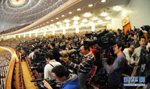 2012年3月4日上午11時,十一屆全國人大五次會議在人民大會堂三樓金色大廳舉行新聞發(fā)布會,由大會發(fā)言人就會議議程和人大工作相關(guān)的問題回答中外記者的提問。