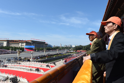 “九三閱兵”這天,李占瑞被安排在天安門城樓的第一排。雖然經過了前兩天的車馬勞頓和活動安排,李占瑞依舊神采奕奕?!疤彀查T第一排有我的座位,還寫著我的名字。我扶著欄桿,上面下面都看見了,看的很清楚。開始是直升機,有200多架,后來是戰(zhàn)斗機、轟炸機、運輸機,還有無人駕駛飛機。我都看到了。還有導彈,無數(shù)的導彈。這都是國家的國防武器,可以防止敵人侵略呀!”李占瑞爬滿褶皺的臉上閃著光。