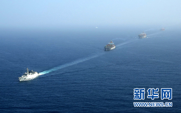 2009年1月6日,在中國海軍護(hù)航艦艇編隊(duì)武漢號(hào)導(dǎo)彈驅(qū)逐艦的帶領(lǐng)下,被護(hù)航的中國商船一字排開航行。 2009年4月28日,中國人民解放軍海軍第一批赴亞丁灣護(hù)航編隊(duì),圓滿完成護(hù)航任務(wù)后返回海南三亞某軍港。由武漢號(hào)導(dǎo)彈驅(qū)逐艦、??谔?hào)導(dǎo)彈驅(qū)逐艦和微山湖號(hào)綜合補(bǔ)給艦組成的海軍首批護(hù)航編隊(duì),在124個(gè)日夜里連續(xù)航行33000多海里,為41批166艘船舶實(shí)施了伴隨護(hù)航,為46艘船舶提供了區(qū)域護(hù)航,成功救援了3艘遇襲外國船只,安全、順利、圓滿地完成了護(hù)航任務(wù)。新華社發(fā)