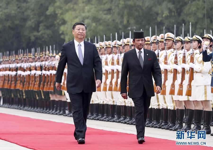 9月13日,國(guó)家主席習(xí)近平在北京人民大會(huì)堂同文萊蘇丹哈桑納爾舉行會(huì)談。這是會(huì)談前,習(xí)近平在人民大會(huì)堂東門(mén)外廣場(chǎng)為哈桑納爾舉行歡迎儀式。新華社記者 謝環(huán)馳 攝
