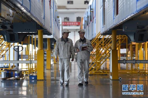 姚鴻洲(右)與同事在車間里從兩列正在實(shí)施組裝作業(yè)的車廂間走過(guò)(10月31日攝)。新華社記者 唐奕 攝