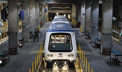 為了保證小火車安全運行,在位于地下十六米的首都機場博維公司維修車間,原本三節(jié)一組的列車被拆分開,十余位工作人員正在對捷運列車進行例行檢修。隨著千斤頂?shù)木徛?,一?jié)車廂被抬升到離地一米的高度,兩名工作人員持手電對車底進行檢修。工作人員介紹,在列車累計行駛達9600公里以上時都要進行一次系統(tǒng)檢修。
