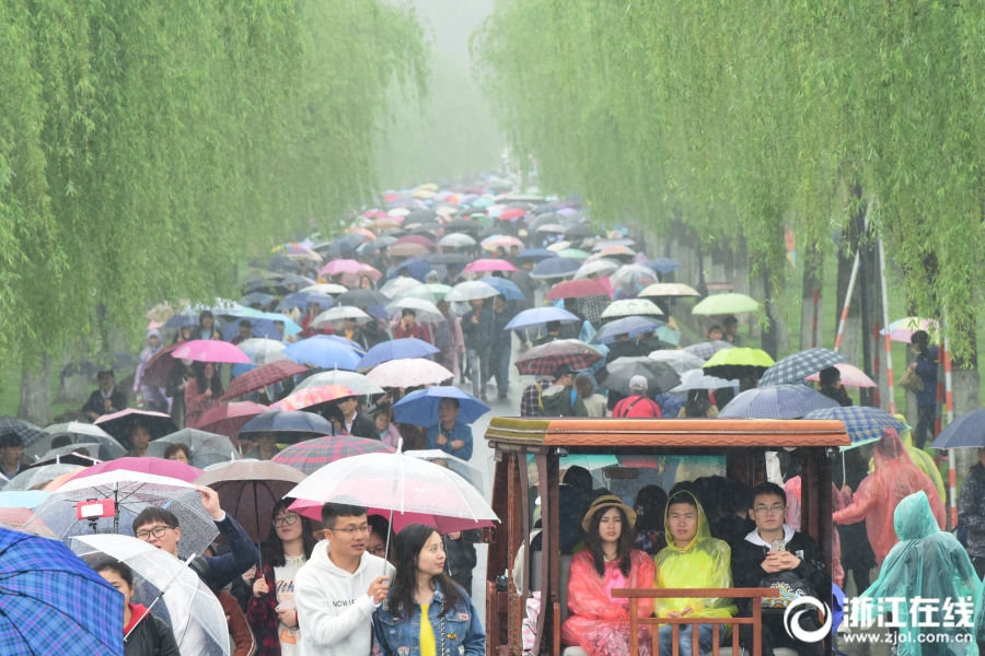 4月5日,清明小長假首日,杭州細(xì)雨綿綿,西湖景區(qū)游客絡(luò)繹不絕。杭城雖降雨降溫,但西湖景區(qū)前來賞花踏青的游客如潮,斷橋似人橋。(浙江在線拍友 里爾 柱子 攝)