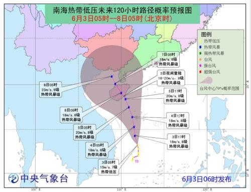 據(jù)中央氣象臺消息,預計3日夜間至5日,西南地區(qū)東部、江南、華南等地自西向東將有一次較強降水天氣過程;南海及華南等地將有較大風雨天氣,中央氣象臺3日06時繼續(xù)發(fā)布熱帶低壓預報。