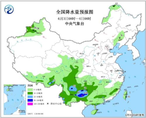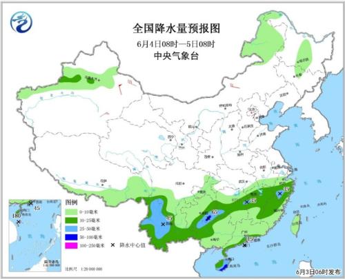 6月3日08時至4日08時,新疆中北部、青藏高原中東部、甘肅南部、西南地區(qū)大部、江南中南部、華南大部等地有小到中雨,西南地區(qū)東部和南部、華南北部和中部等地的局地有大雨或暴雨(100~120毫米),上述局部地區(qū)將伴有短時強降水等強對流天氣。新疆北部、內(nèi)蒙古東部、華北西部等地的部分地區(qū)有4~6級風,其中北疆山口地區(qū)陣風可達9~10級。南海中南部等地將有6-8級大風,陣風9級。