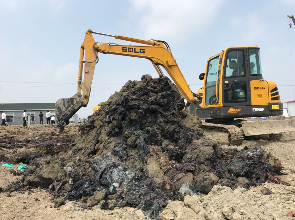 6月15日,也即中央第四環(huán)保督察組下沉泰州市當(dāng)日,督察人員便調(diào)來挖掘機(jī),對群眾舉報區(qū)域隨機(jī)選點(diǎn)進(jìn)行試探性挖掘。讓人沒有想到的是,僅僅數(shù)鏟之后,半米左右的沙土層之下就現(xiàn)出黑色的化工廢料,刺激性氣味強(qiáng)烈。
