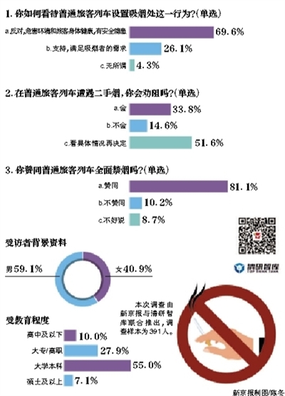 2017年6月,因在普通旅客列車上遭遇二手煙,大學(xué)生李華將哈爾濱鐵路局告上法庭,索賠購票款102.5元,同時要求取消有關(guān)站臺及該趟列車內(nèi)的吸煙區(qū)、拆除煙具,禁止在上述區(qū)域吸煙,并賠償精神損失費(fèi)人民幣1元等。6月25日下午,北京鐵路運(yùn)輸法院作出一審判決,要求鐵路局在相關(guān)列車上拆除煙具,取消吸煙區(qū)。被告人哈鐵局稱,“我國有3億吸煙者,提高服務(wù)質(zhì)量應(yīng)體現(xiàn)在對上述人群進(jìn)行疏導(dǎo)而不是全面禁煙”。對此,我們需要關(guān)注什么?本期“京報(bào)調(diào)查”(新京報(bào)與清研智庫聯(lián)合推出)就此展開調(diào)查。