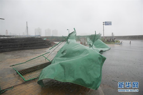 7月22日,在上海吳淞口國(guó)際郵輪碼頭,岸邊的防護(hù)欄被大風(fēng)吹垮。據(jù)上海中心氣象臺(tái)消息,今年第10號(hào)臺(tái)風(fēng)“安比”(強(qiáng)熱帶風(fēng)暴級(jí))的中心已于7月22日12時(shí)30分在上海崇明東部登陸,登陸時(shí)中心附近最大風(fēng)力有10級(jí)(28米/秒),中心最低氣壓982百帕,登陸后繼續(xù)向西北方向移動(dòng),強(qiáng)度逐漸減弱。新華社記者丁汀攝