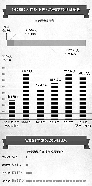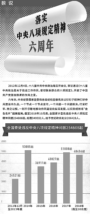 六年來,中央紀委國家監(jiān)委和各級紀檢監(jiān)察機關以釘釘子精神打好作風建設持久戰(zhàn),一個節(jié)點一個節(jié)點堅守,一個問題一個問題解決,盯緊盯牢、持之以恒,一刻不停歇地推動作風建設向縱深發(fā)展,以實際成效將“金色名片”越擦越亮。截至2018年10月底,全國累計查處違反中央八項規(guī)定精神問題254808起,處理349552人,給予黨紀政務處分206428人。