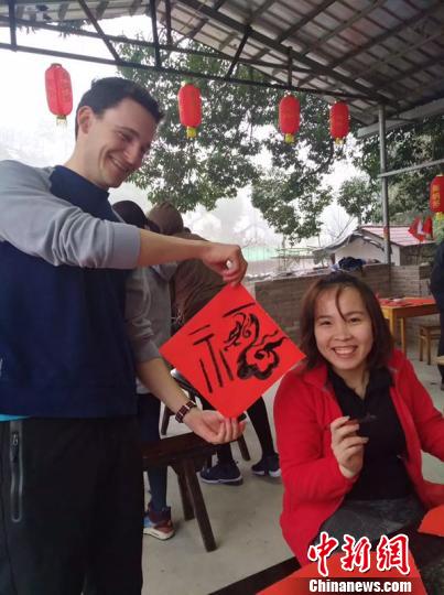外國(guó)游客學(xué)寫(xiě)春聯(lián) 武義提供