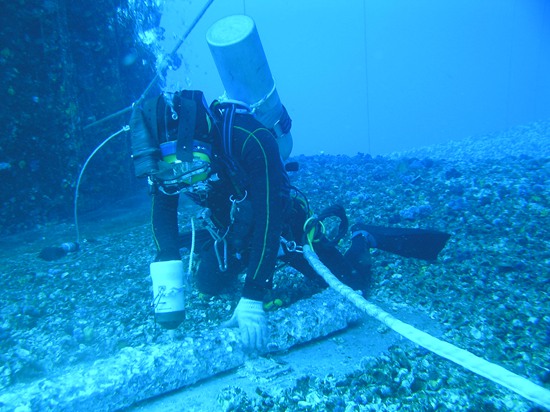 因?yàn)楣こ虧撍枰谒麻L(zhǎng)時(shí)間作業(yè),打撈局的潛水員們不能像人們常見的潛水員那樣,利用背后的氣瓶供氣。他們靠一根甘蔗粗細(xì)的長(zhǎng)管來維持水下的呼吸,在工程潛水領(lǐng)域,這根管子被稱作“臍帶”。
