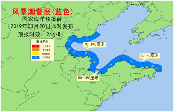 受冷空氣和出海氣旋的共同影響,預(yù)計:3月20日傍晚到21日中午,渤海灣將出現(xiàn)70到140厘米的風(fēng)暴增水,萊州灣將出現(xiàn)80到180厘米的風(fēng)暴增水,山東半島北部沿海將出現(xiàn)30到70厘米的風(fēng)暴增水。上述岸段內(nèi)的天津塘沽、河北曹妃甸、黃驊和山東濱州港潮位站將于21日凌晨出現(xiàn)達到當(dāng)?shù)厮{色警戒潮位的高潮位。天津市、河北省唐山市、滄州市和山東省濱州市的風(fēng)暴潮預(yù)警級別為藍色。