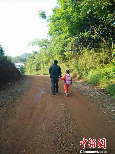 愛(ài)心志愿者康雄牽著“事實(shí)孤兒”去上學(xué)的背景。 長(zhǎng)沙市岳麓區(qū)大愛(ài)無(wú)疆公益文化促進(jìn)會(huì)供圖 攝