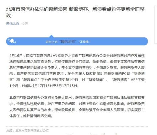 新浪網(wǎng)負(fù)責(zé)人表示,將嚴(yán)格落實(shí)網(wǎng)信部門(mén)管理要求,在全面深入整改期間對(duì)問(wèn)題突出的PC端“新浪博客”和“新浪看點(diǎn)”平臺(tái)自行暫停更新1個(gè)月,對(duì)“新浪新聞”、“新浪博客”APP下架1個(gè)月,時(shí)間從4月17日15時(shí)至5月17日15時(shí)。