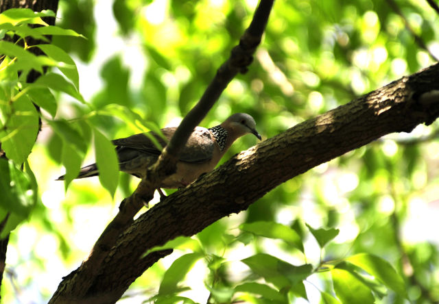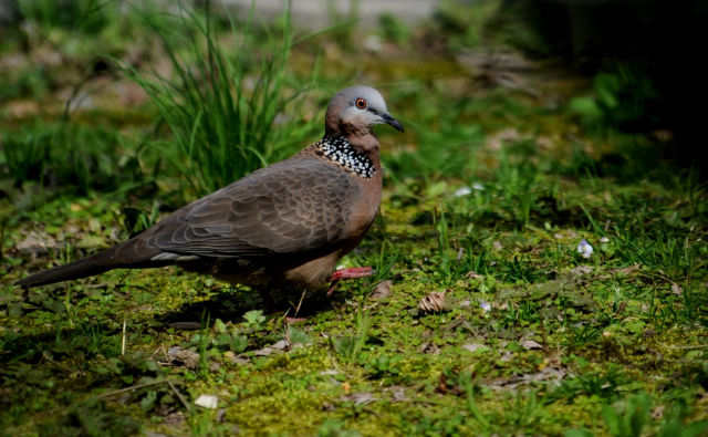 記者居住的小區(qū)里鳥也很多,陽臺(tái)下面一棵廣玉蘭樹上,一對(duì)珠頸斑鳩已經(jīng)安家了很多年。經(jīng)??匆姴弊由虾孟翊髦蝗φ渲轫?xiàng)鏈的珠頸斑鳩,結(jié)伴到小區(qū)草地上覓食,熟悉得好像小區(qū)里的老鄰居。