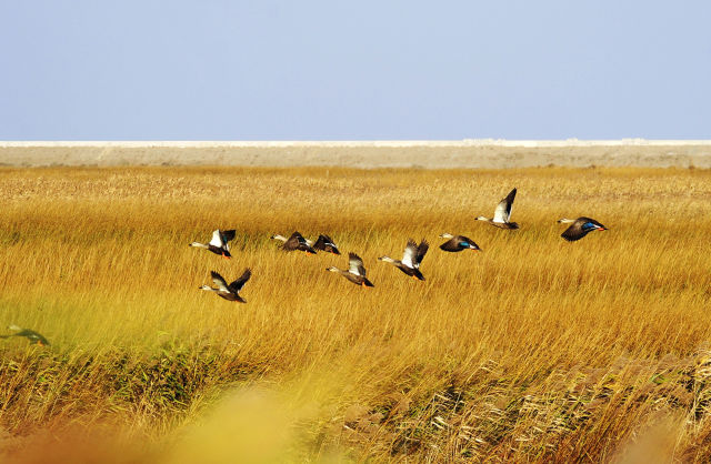 這組照片拍攝于上海著名的崇明東灘濕地,當(dāng)時(shí)正值初冬時(shí)節(jié)。曲水彎環(huán)的蘆葦叢中,成群結(jié)隊(duì)的越冬候鳥時(shí)而悠閑覓食,時(shí)而群鳥歡飛,譜寫了一曲美妙的自然樂章。