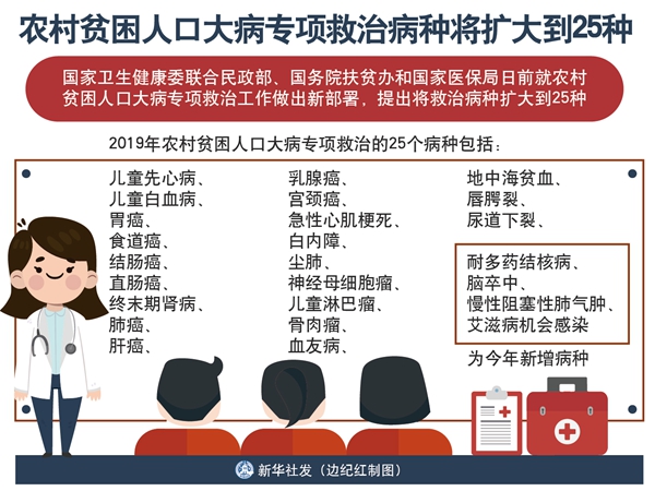 記者從國家衛(wèi)健委獲悉,2019年農(nóng)村貧困人口大病專項救治的25個病種包括:兒童先心病、兒童白血病、胃癌、食道癌、結(jié)腸癌、直腸癌、終末期腎病、肺癌、肝癌、乳腺癌、宮頸癌、急性心肌梗死、白內(nèi)障、塵肺、神經(jīng)母細胞瘤、兒童淋巴瘤、骨肉瘤、血友病、地中海貧血、唇腭裂、尿道下裂、耐多藥結(jié)核病、腦卒中、慢性阻塞性肺氣腫、艾滋病機會感染。其中,后四種為今年新增病種。