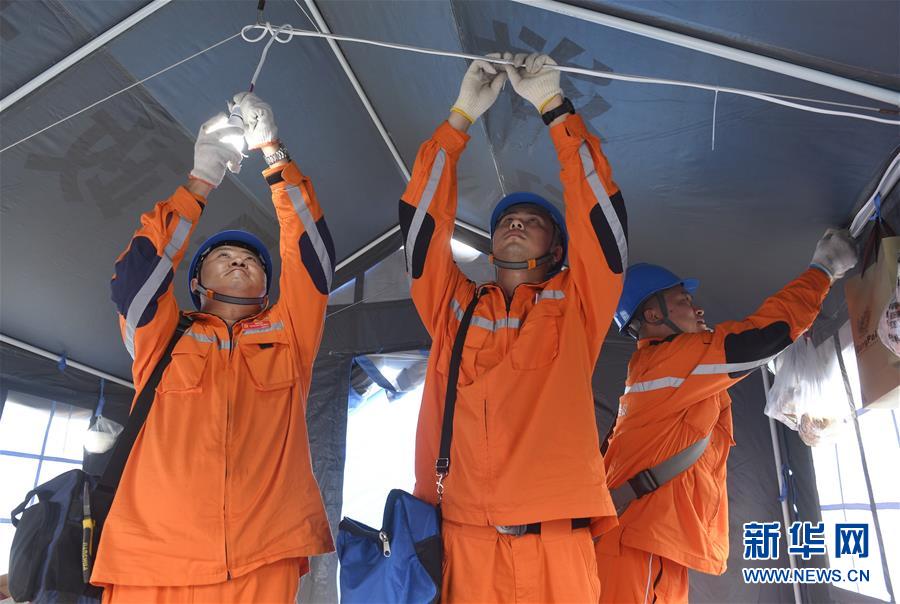6月20日,國網(wǎng)成都供電公司連心橋共產(chǎn)黨員服務(wù)隊抗震救災(zāi)臨時黨支部成員在安置點帳篷內(nèi)架設(shè)電線、安裝電燈。新華社記者 劉坤 攝