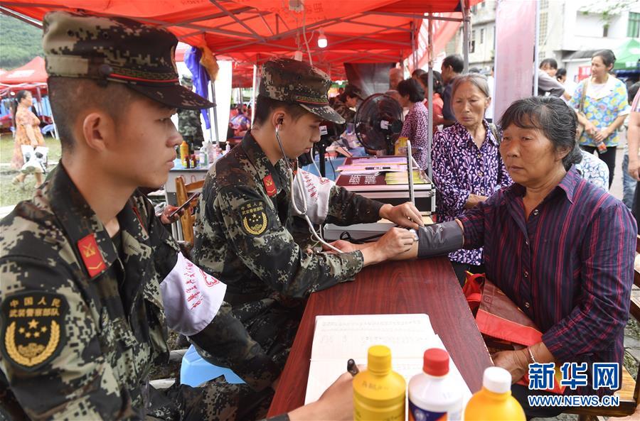 6月20日,武警宜賓支隊衛(wèi)生隊黨小組成員在安置點為群眾提供醫(yī)療服務(wù)。新華社記者 劉坤 攝