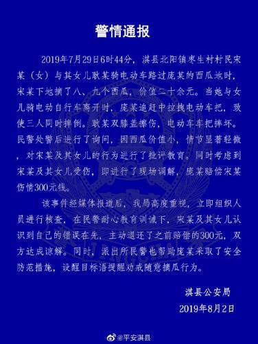 根據(jù)淇縣公安局官方微博發(fā)布的通報,7月29日6時44分,淇縣北陽鎮(zhèn)棗生村村民宋某(女)與其女兒耿某騎電動車路過龐某的西瓜地時,宋某下地摘了八、九個西瓜,價值二十余元。當(dāng)她與女兒騎電動自行車離開時,龐某追趕中拉拽電動車把,致使三人同時摔倒。耿某雙膝蓋擦傷,電動車車把摔壞。民警出警后進(jìn)行了詢問,因西瓜價值小,情節(jié)顯著輕微,對宋某及其女兒的行為進(jìn)行了批評教育。同時考慮到宋某及其女兒受傷,即進(jìn)行了現(xiàn)場調(diào)解,龐某賠償宋某傷情300元。