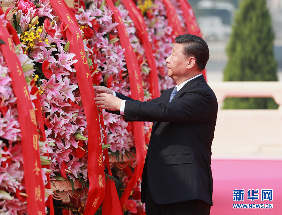 9月30日上午,習(xí)近平、李克強(qiáng)、栗戰(zhàn)書、汪洋、王滬寧、趙樂際、韓正、王岐山等黨和國家領(lǐng)導(dǎo)人來到北京天安門廣場,出席烈士紀(jì)念日向人民英雄敬獻(xiàn)花籃儀式。這是習(xí)近平整理花籃上的緞帶。 新華社記者 龐興雷 攝