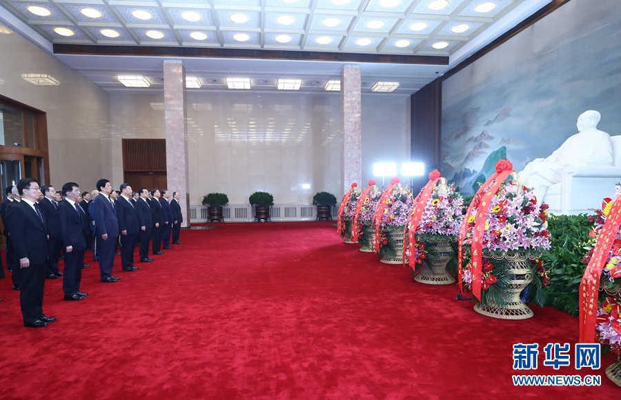 敬獻(xiàn)花籃儀式前,習(xí)近平、李克強(qiáng)、栗戰(zhàn)書、汪洋、王滬寧、趙樂際、韓正、王岐山等領(lǐng)導(dǎo)同志來到毛主席紀(jì)念堂。北大廳內(nèi),中共中央,全國人大常委會,國務(wù)院,全國政協(xié),中央軍委,各民主黨派、全國工商聯(lián)和無黨派愛國人士敬獻(xiàn)的花籃擺放在毛澤東同志坐像正前方。習(xí)近平等向毛澤東同志坐像三鞠躬,隨后來到瞻仰廳,瞻仰毛澤東同志遺容,表達(dá)對毛澤東同志等老一輩革命家的深切緬懷。