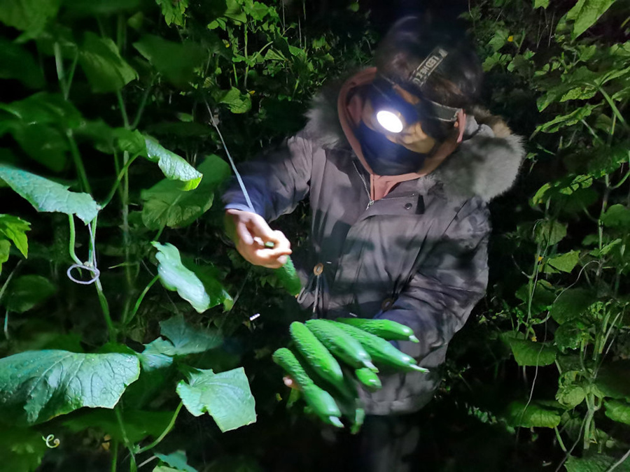1月28日,山東省壽光市的蔬菜種植戶凌晨1點多在大棚里采摘蔬菜。新華社發(fā)