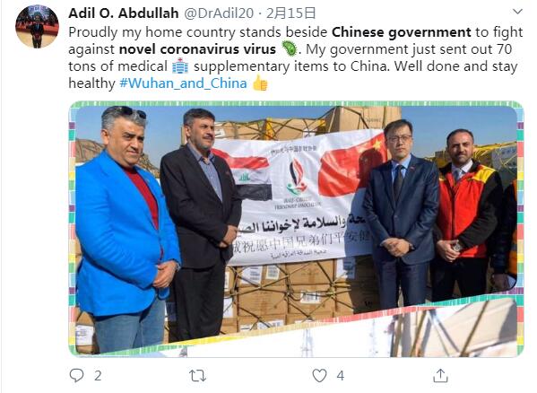 推特用戶Adil O. Abdullah說:我的祖國支持中國政府抗擊新冠肺炎病毒,我為此感到驕傲。我們的政府向中國送去了70噸的醫(yī)療補給物資,干得不錯。武漢和全中國都要平安康泰。