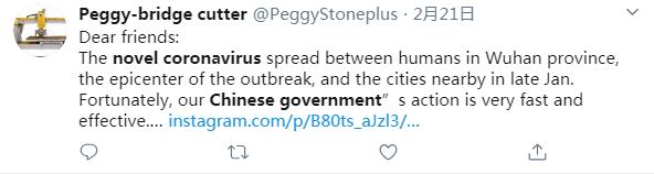 推特用戶Peggy-bridge cutter說:親愛的朋友們,新冠肺炎疫情在武漢和周邊城市暴發(fā)。所幸,中國政府采取了迅速、有效的行動。