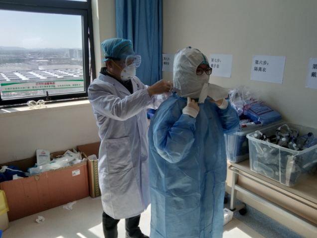首先是防護(hù)裝備。進(jìn)隔離病房一般是三級(jí)防護(hù),除穿戴防護(hù)服、隔離衣、護(hù)目鏡、N95口罩、兩層手套,兩層腳套外,還要戴正壓防護(hù)頭套或一次性全面型防護(hù)頭套。此外,頭套還帶有新風(fēng)過濾系統(tǒng)。整套防護(hù)裝備,凌肯在老師的幫助下,花了半個(gè)小時(shí)才穿上。穿戴完畢,凌肯整個(gè)人都很難受。護(hù)目鏡起霧,頭套風(fēng)機(jī)發(fā)出巨大噪音,還有悶熱,整個(gè)人都變得遲鈍。