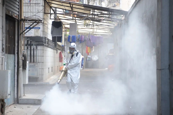 2月5日,長沙藍(lán)天救援隊(duì)隊(duì)員在長沙市馬王街社區(qū)內(nèi)消毒殺菌。新華社發(fā)(陳振海攝)